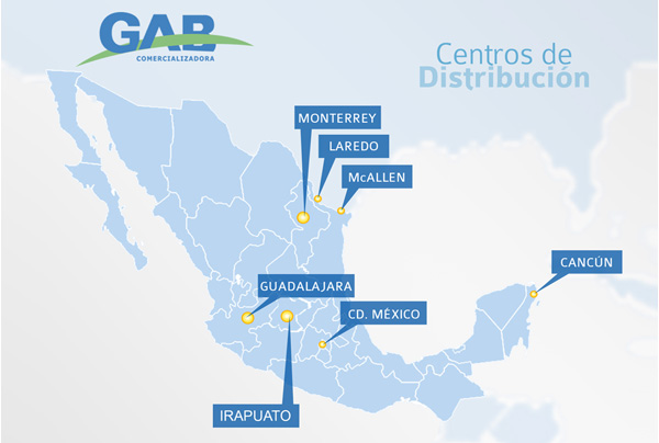 Comercializadora GAB distribuye sus productos en el mercado nacional y exporta a todo el mundo. Para ello cuenta con Centros de Distribución estratégicamente ubicados en la Ciudad de México, Monterrey, Guadalajara, Cancún y Puerto Vallarta, así como en McAllen y Laredo dentro de la Unión Americana.