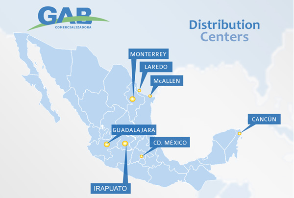 Comercializadora GAB distributes its products in the domestic market and exported around the world. To achieve this has strategically located distribution centers in Mexico City, Monterrey, Guadalajara and Cancun, as well as in McAllen and Laredo in the United States.